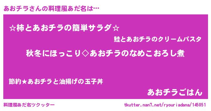 | 意味不明あだ名 | 『ニラ科あおチラ属』『ペロリンあおチラ』 |