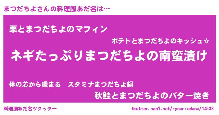 | ピコ太郎風あだ名 | 『マコ三郎』『ピコマ郎』『マツ六郎』 |