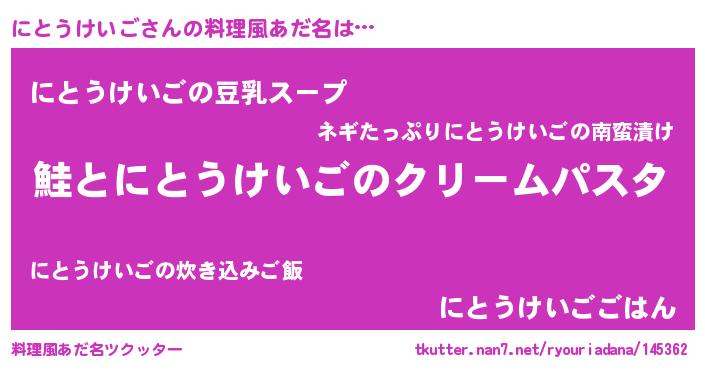 | 男性向けラノベタイトル風あだ名 | 『ノーゲーム・ノーニトウケイゴ』 |