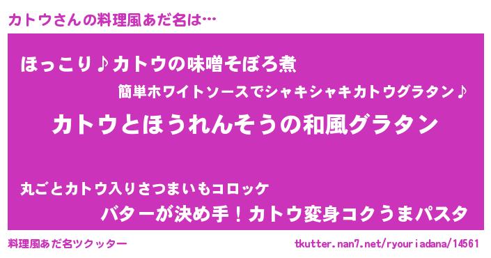 | ヘコむあだ名 | 『カトふぇ~』『カトぷりん』『豆乳』 |