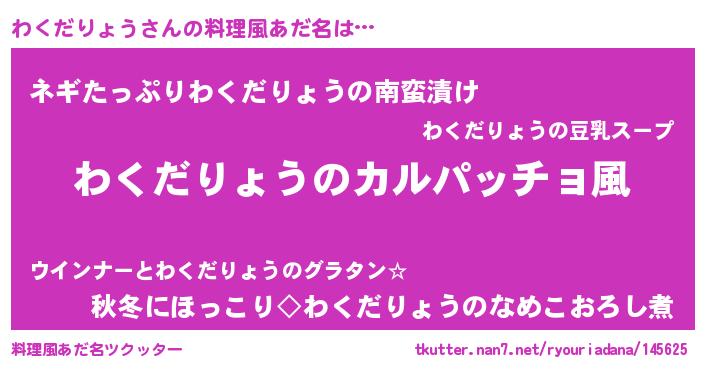 | 女子向けラノベタイトル風あだ名 | 『わくだりょうが死なない童話 林檎のわくだりょうの診療簿』 |