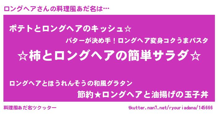 | 胡散臭い通販商品みたいなあだ名 | 『信頼と実績のサプリメント…その名も「ロングヘア」』 |