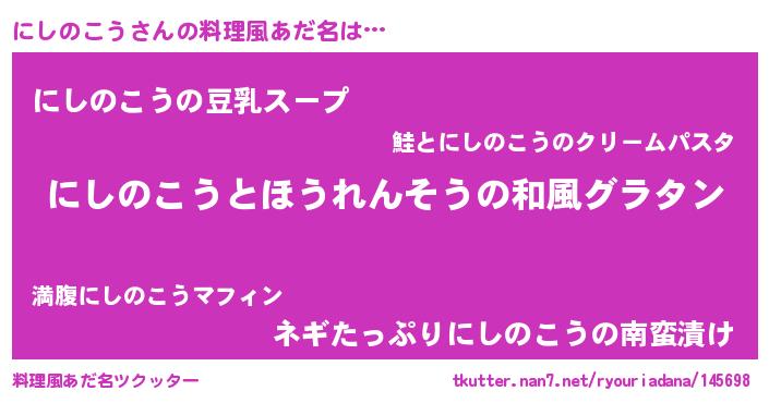 | 男性向けラノベタイトル風あだ名 | 『にしのこう~年齢イコール彼女いない歴の魔法使い~』 |