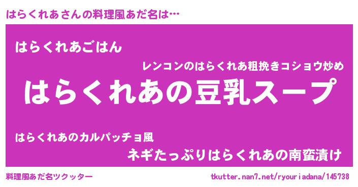 | 男性向けラノベタイトル風あだ名 | 『ダンジョンにはらくれあを求めるのは間違っているだろうか』 |