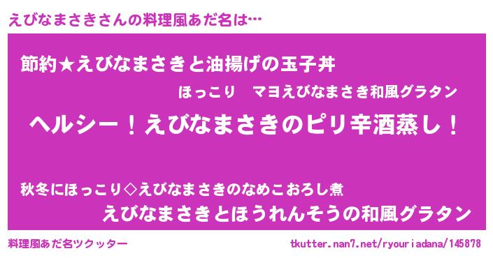 | 男性向けラノベタイトル風あだ名 | 『Re:えびなまさきから始める異世界生活』 |