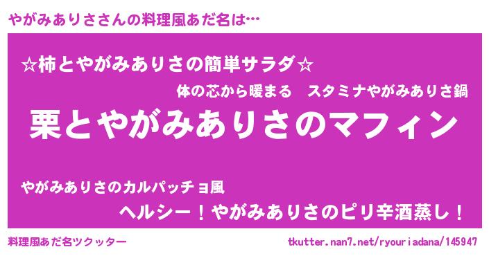 | 胡散臭い通販商品みたいなあだ名 | 『テレビで話題の高麗人参…その名も「やがみありさ」』 |