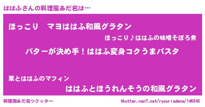 | 女子向けラノベタイトル風あだ名 | 『ははふ恋絵巻』『ははふの玉の輿計画!』 |