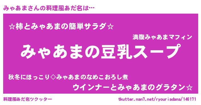 | 女子向けラノベタイトル風あだ名 | 『みゃあまは平凡を望む』 |