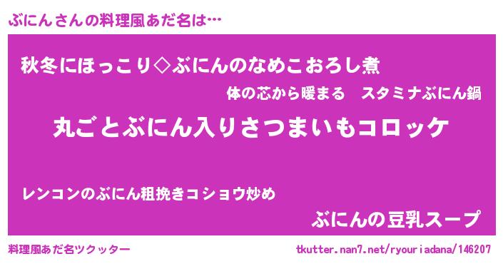 | ピコ太郎風あだ名 | 『ブニ史郎』『ピブ四郎』『ブコ三郎』 |