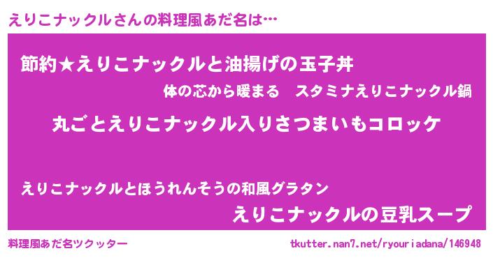 | 女子向けラノベタイトル風あだ名 | 『乙女ゲームの破滅フラグしかない悪役えりこナックルに転生してしまった…』 |