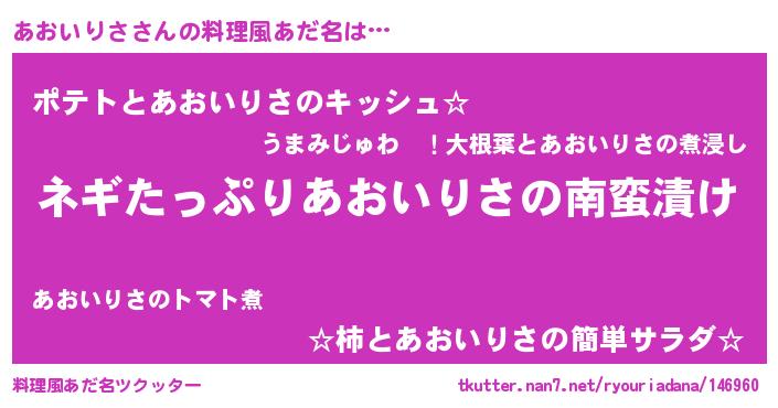 | ポケモン風あだ名 | 『アオチュウ』『ヒアオイリサ』 |