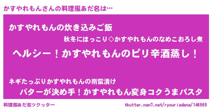 | 男性向けラノベタイトル風あだ名 | 『Re:かすやれもんから始める異世界生活』 |