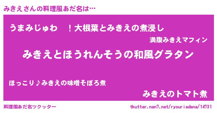 | 男性向けラノベタイトル風あだ名 | 『みきえ~年齢イコール彼女いない歴の魔法使い~』 |