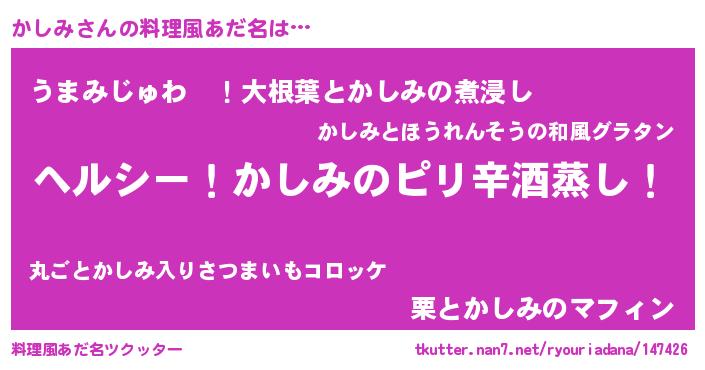 | 男性向けラノベタイトル風あだ名 | 『Re:かしみから始める異世界生活』 |
