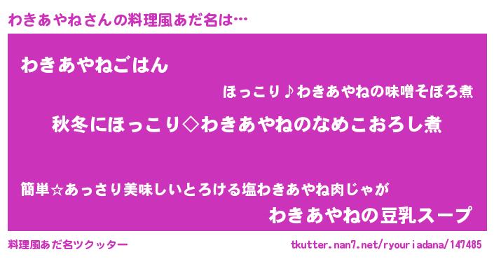 | 男性向けラノベタイトル風あだ名 | 『わきあやねに滅ぼされるだけの簡単なお仕事です』 |