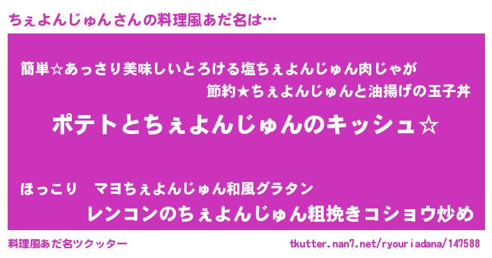 | 女子向けラノベタイトル風あだ名 | 『ちぇよんじゅんの卵を拾いまして』 |