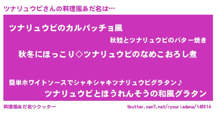 | 意味不明あだ名 | 『住所不定無職ツナリュウビ(47歳)』 |