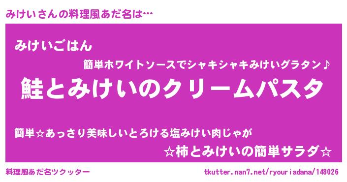 | 女子向けラノベタイトル風あだ名 | 『死神みけいの再婚』『みけい様がみてる』 |