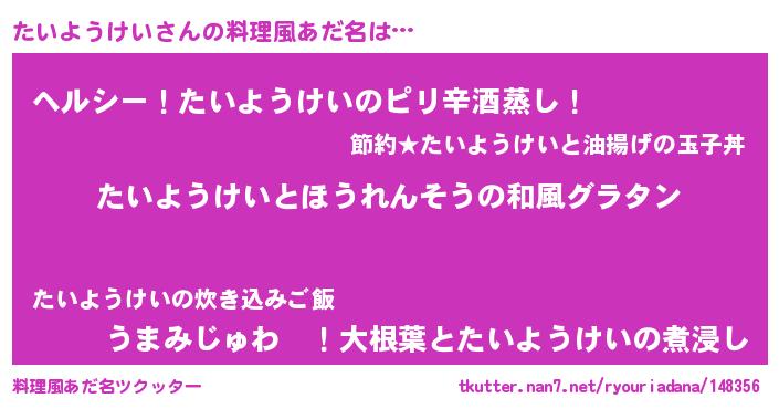 | 男性向けラノベタイトル風あだ名 | 『たいようけい~年齢イコール彼女いない歴の魔法使い~』 |