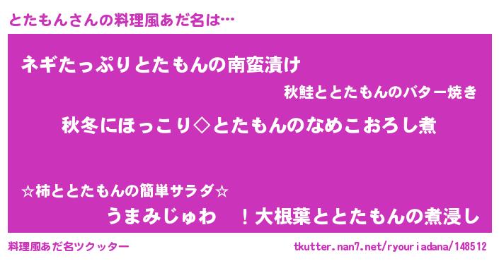 | 男性向けラノベタイトル風あだ名 | 『とたもんに滅ぼされるだけの簡単なお仕事です』 |