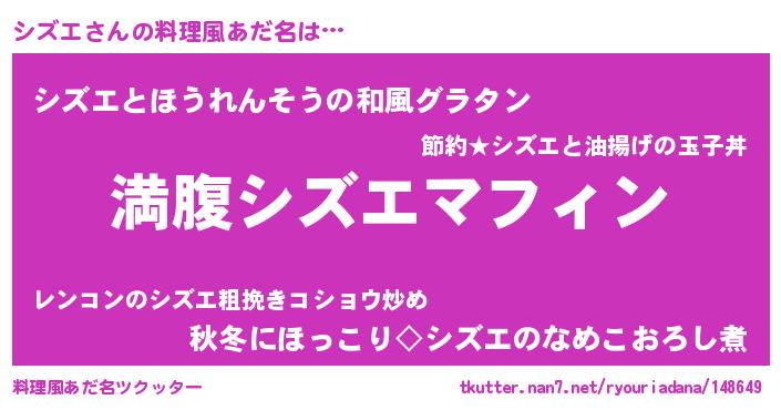 | ヘコむあだ名 | 『シズエ(笑)』『シズもー』『シズを』 |