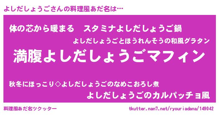 | 胡散臭い通販商品みたいなあだ名 | 『絶対に幸福をもたらす健康食品…その名も「よしだしょうご」』 |