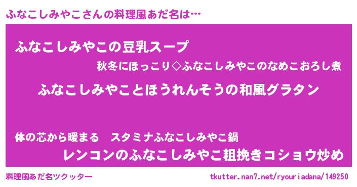 | 男性向けラノベタイトル風あだ名 | 『転生したらふなこしみやこだった件』 |