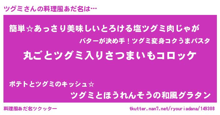| ヒーロー風カッコイイあだ名 | 『仮面ツグダー』『ネオツグミ』 |