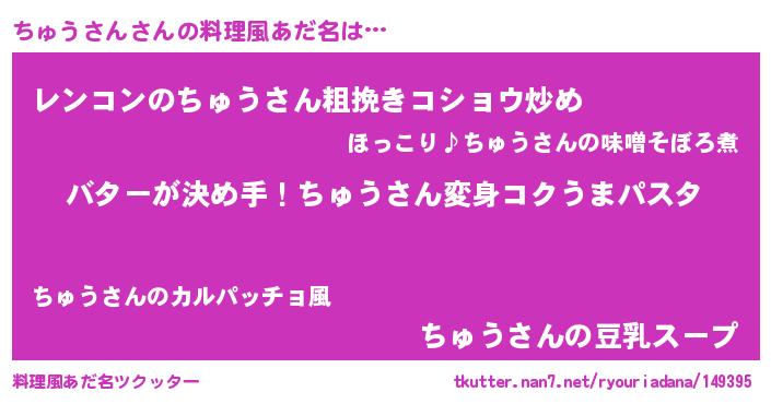 | ヒーロー風カッコイイあだ名 | 『慈愛の使者ちゅうさん』『暗黒騎士チュ』 |