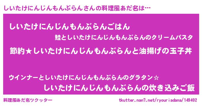 | 男性向けラノベタイトル風あだ名 | 『シイタケニンジンモンブランアートオンライン』 |