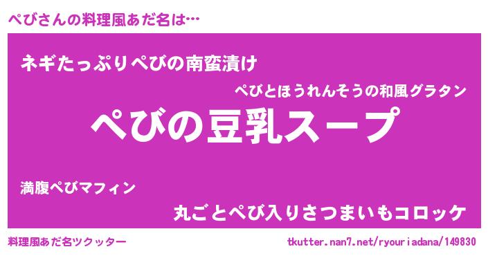 | 胡散臭い通販商品みたいなあだ名 | 『信頼と実績のサプリメント…その名も「ぺび」』 |