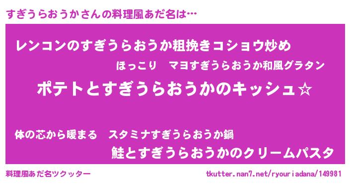 | 男性向けラノベタイトル風あだ名 | 『すぎうらおうかの嫁は女の子じゃないと思った?』 |