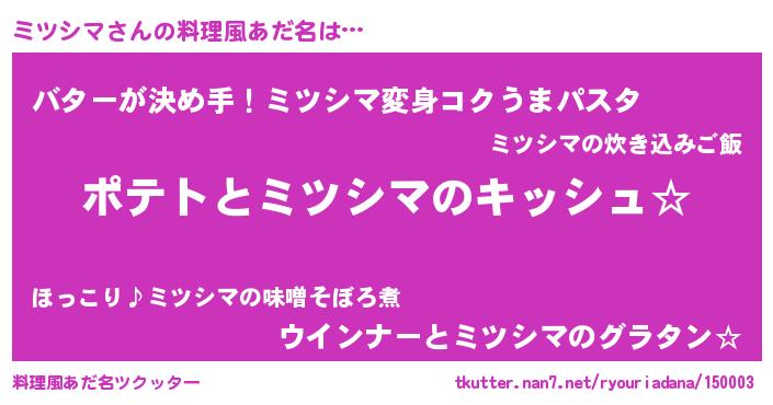 | 女子向けラノベタイトル風あだ名 | 『ミツシマの卵を拾いまして』 |
