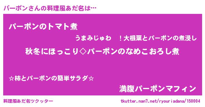 | 男性向けラノベタイトル風あだ名 | 『パーポンに滅ぼされるだけの簡単なお仕事です』 |