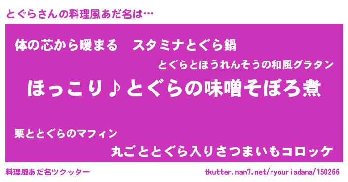 | ヒーロー風カッコイイあだ名 | 『スーパートグラ』『ウルトラとぐらマン』 |