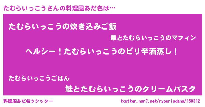 | 男性向けラノベタイトル風あだ名 | 『Re:たむらいっこうから始める異世界生活』 |
