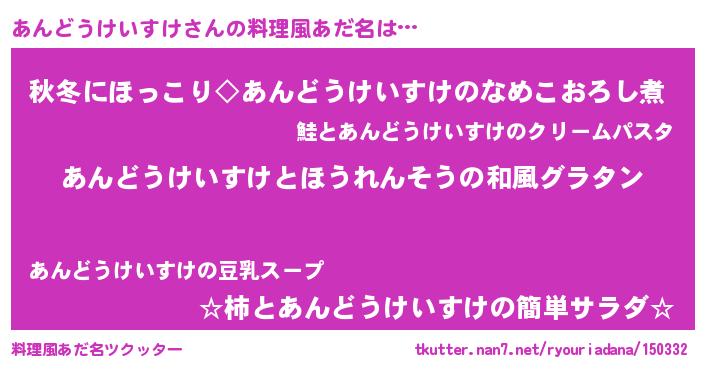 | 女子向けラノベタイトル風あだ名 | 『あんどうけいすけの玉の輿計画!』 |