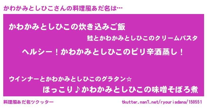| 男性向けラノベタイトル風あだ名 | 『Re:かわかみとしひこから始める異世界生活』 |