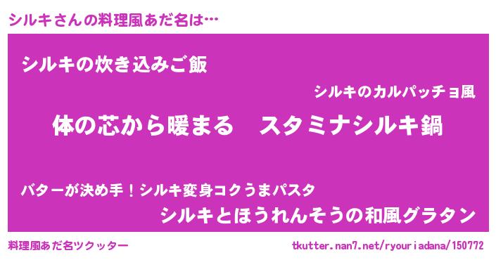 | 女子向けラノベタイトル風あだ名 | 『シルキの雑貨屋さん』『シルキ恋絵巻』 |