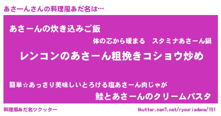 | 胡散臭い通販商品みたいなあだ名 | 『ガンによく効くアガリクス…その名も「あさーん」』 |