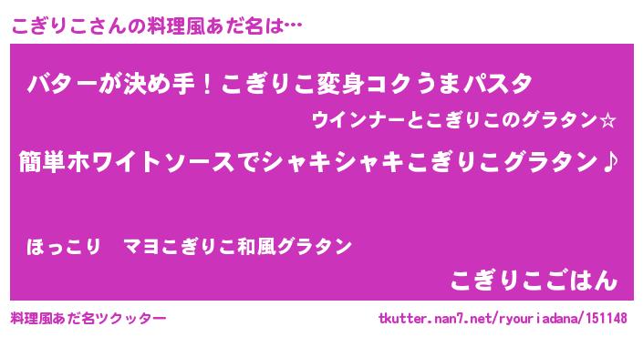 | 男性向けラノベタイトル風あだ名 | 『こぎりこの嫁は女の子じゃないと思った?』 |