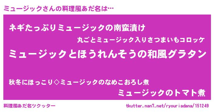 | 女子向けラノベタイトル風あだ名 | 『ミュージックの玉の輿計画!』 |