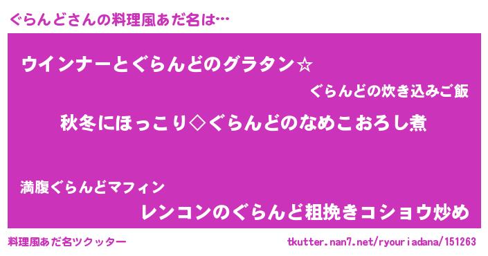 | 男性向けラノベタイトル風あだ名 | 『ぐらんどに滅ぼされるだけの簡単なお仕事です』 |