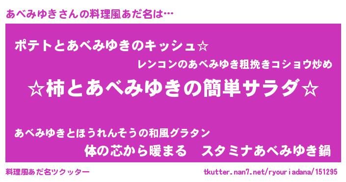 | 胡散臭い通販商品みたいなあだ名 | 『信頼と実績のサプリメント…その名も「あべみゆき」』 |