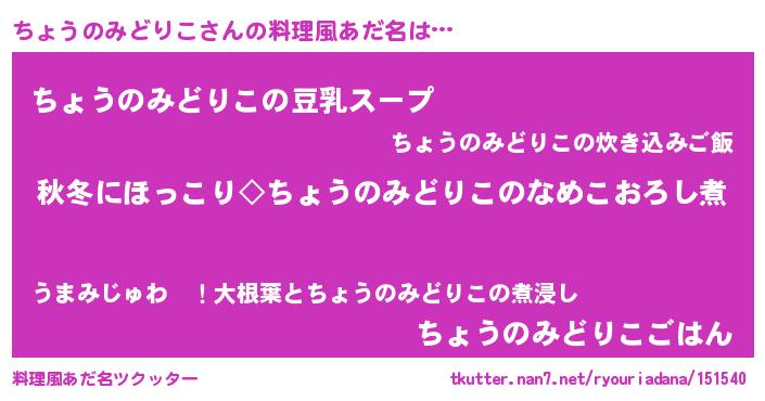 | 男性向けラノベタイトル風あだ名 | 『ちょうのみどりこに滅ぼされるだけの簡単なお仕事です』 |