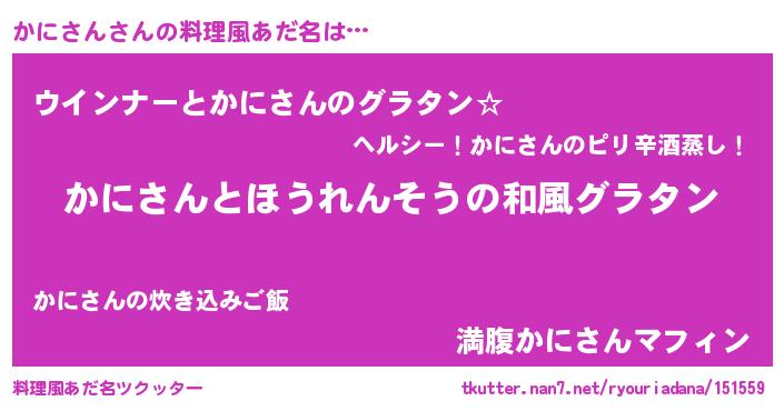 | 女子向けラノベタイトル風あだ名 | 『かにさんの玉の輿計画!』 |