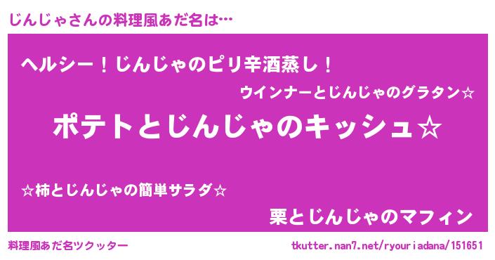 | 女子向けラノベタイトル風あだ名 | 『じんじゃの卵を拾いまして』 |