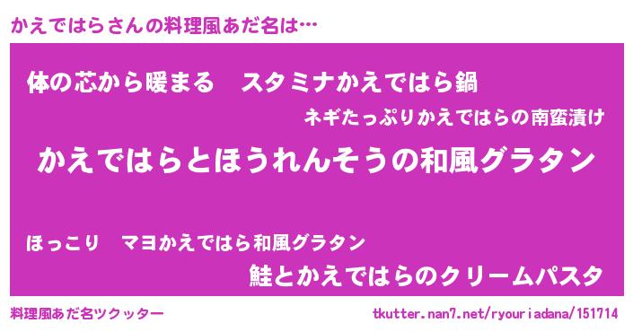 | ヘコむあだ名 | 『酢こんぶ』『かえにー』『かえ太郎』 |