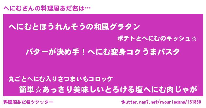 | 女子向けラノベタイトル風あだ名 | 『へにむ恋絵巻』『へにむの玉の輿計画!』 |