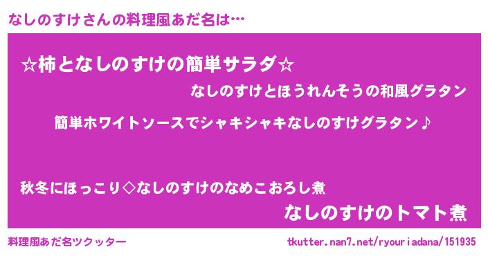 | 男性向けラノベタイトル風あだ名 | 『なしのすけの嫁は女の子じゃないと思った?』 |